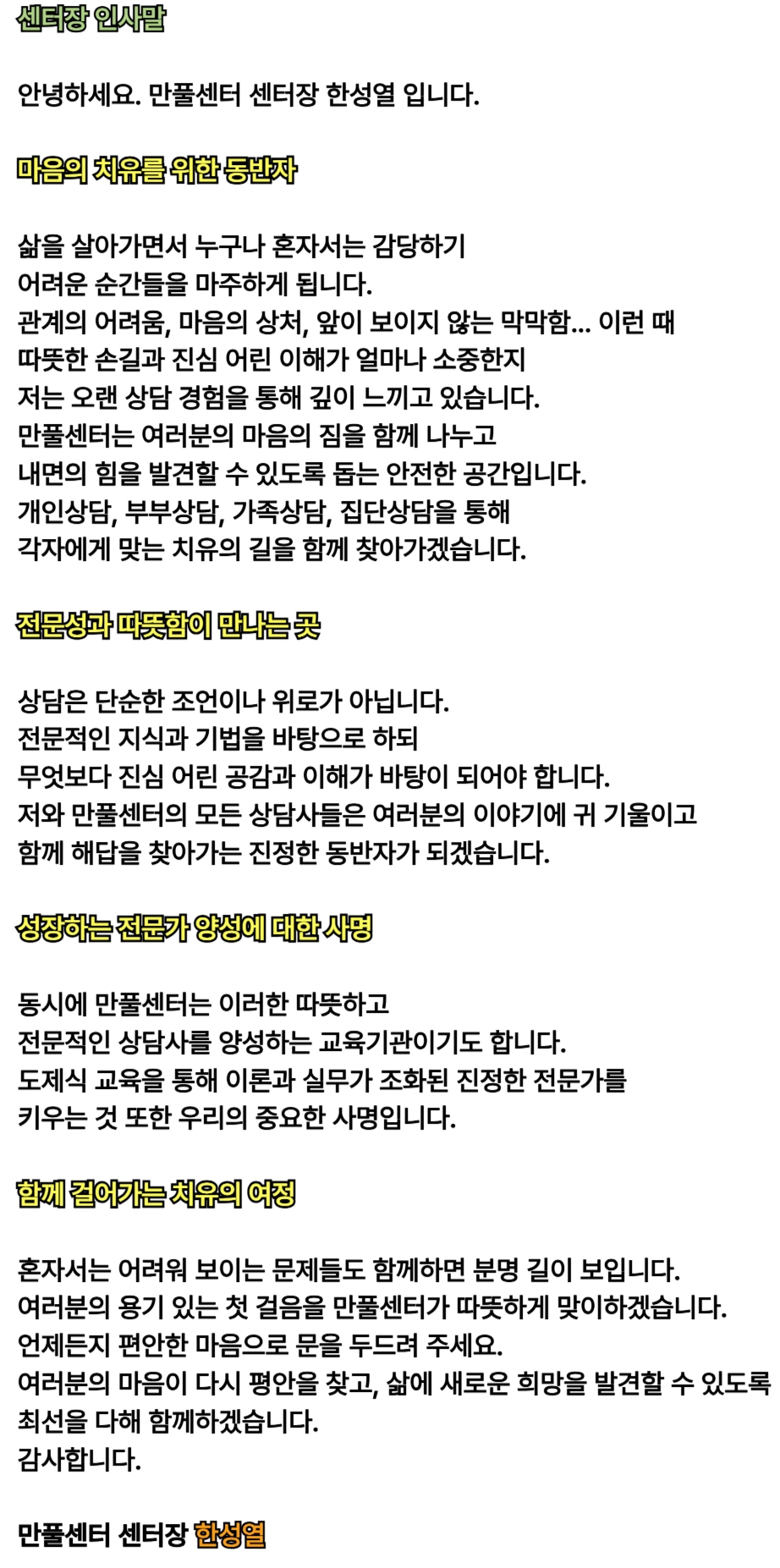 상담의 깊이와 교육의 체계성, 그리고 인간적 따뜻함이 어우러진 특별한 공간, 만풀센터가 여러분의 성장과 변화를 함께하겠습니다.